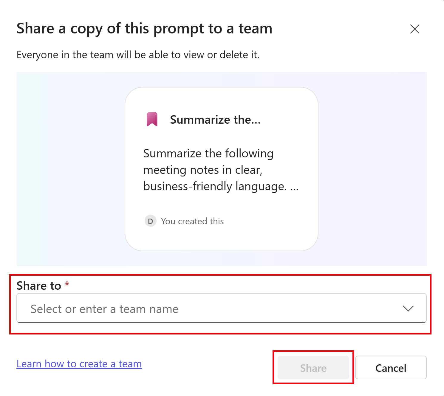 7- Select the team you'd like to share the prompt with and select Share. The teams you see align with the teams you see in Microsoft Teams. At this time, you are not able to share the prompt across multiple teams at once. To do this, you'll need to repeat steps 6 and 7 for each team.