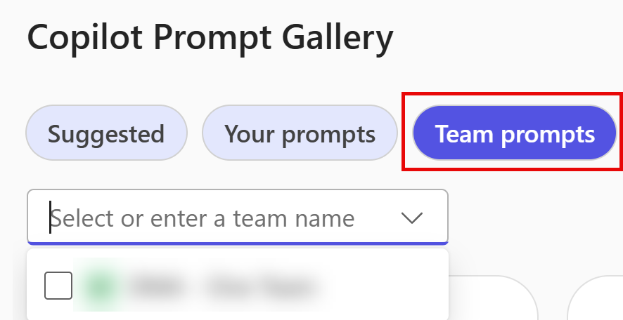8- To view these prompts, select Team prompts from the Prompt Gallery. Use the drop-down to filter the prompts by those for a particular team.