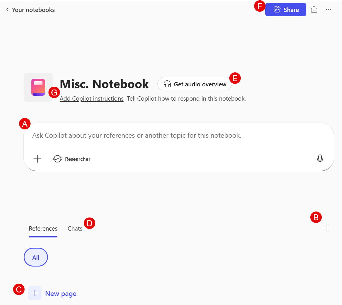 F. Share: Share your Copilot Notebook with your team for collaboration.
